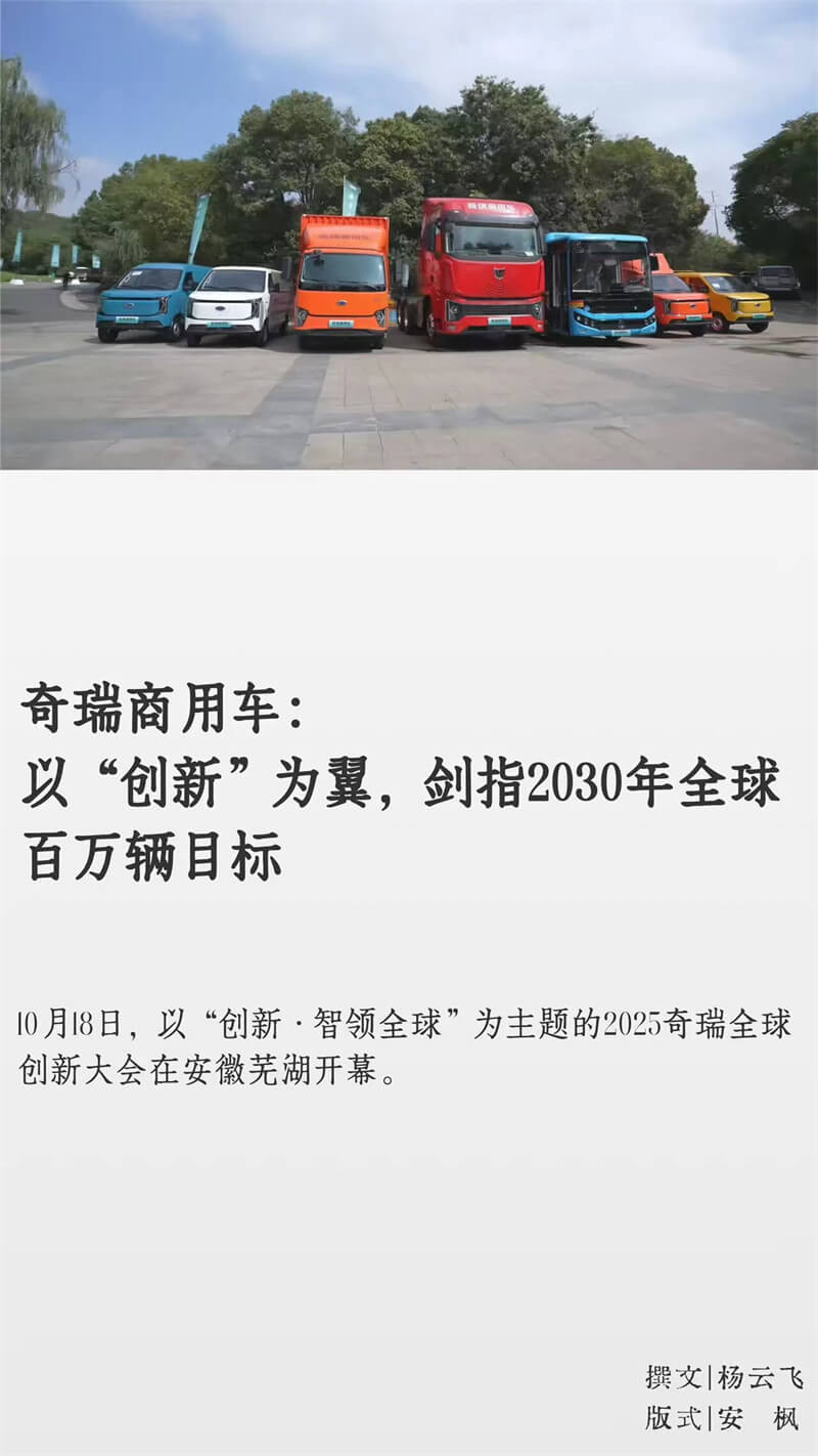从“可靠、舒适、耐久、智能、经济、安全”六大品质维度全面提升产品力,以“乘用车标准”重塑商用车价值标杆。以“技术引领→产品引领→市场引领”稳步推进,确保在行业变革中抢占先机。未来,奇瑞商用车将继续以“乘商同权”深化集团协同,与用户共创“智慧物流生态”,传递美好科技,驱动绿色未来。