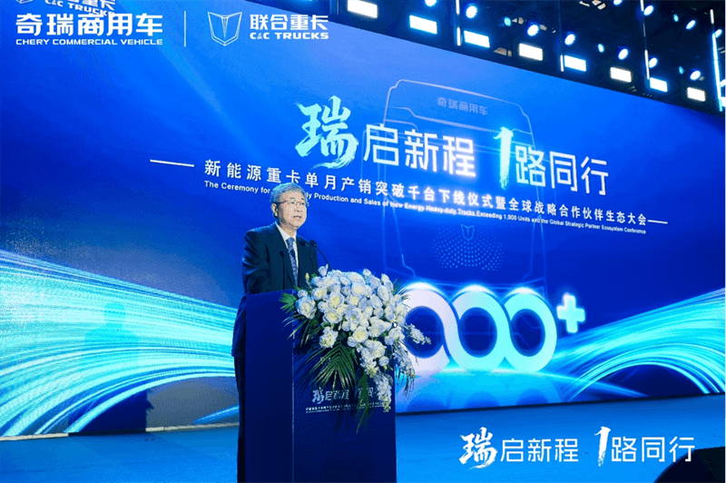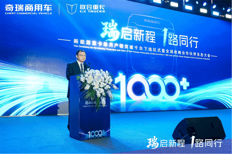 2025年11月7日,奇瑞商用车联合重卡超级工厂内光影璀璨、掌声雷动,以“瑞启新程1路同行”为主题的奇瑞商用车新能源重卡单月产销突破千台下线仪式暨全球战略合作伙伴生态大会隆重举行。奇瑞控股集团董事长尹同跃出席大会并作主旨演讲。