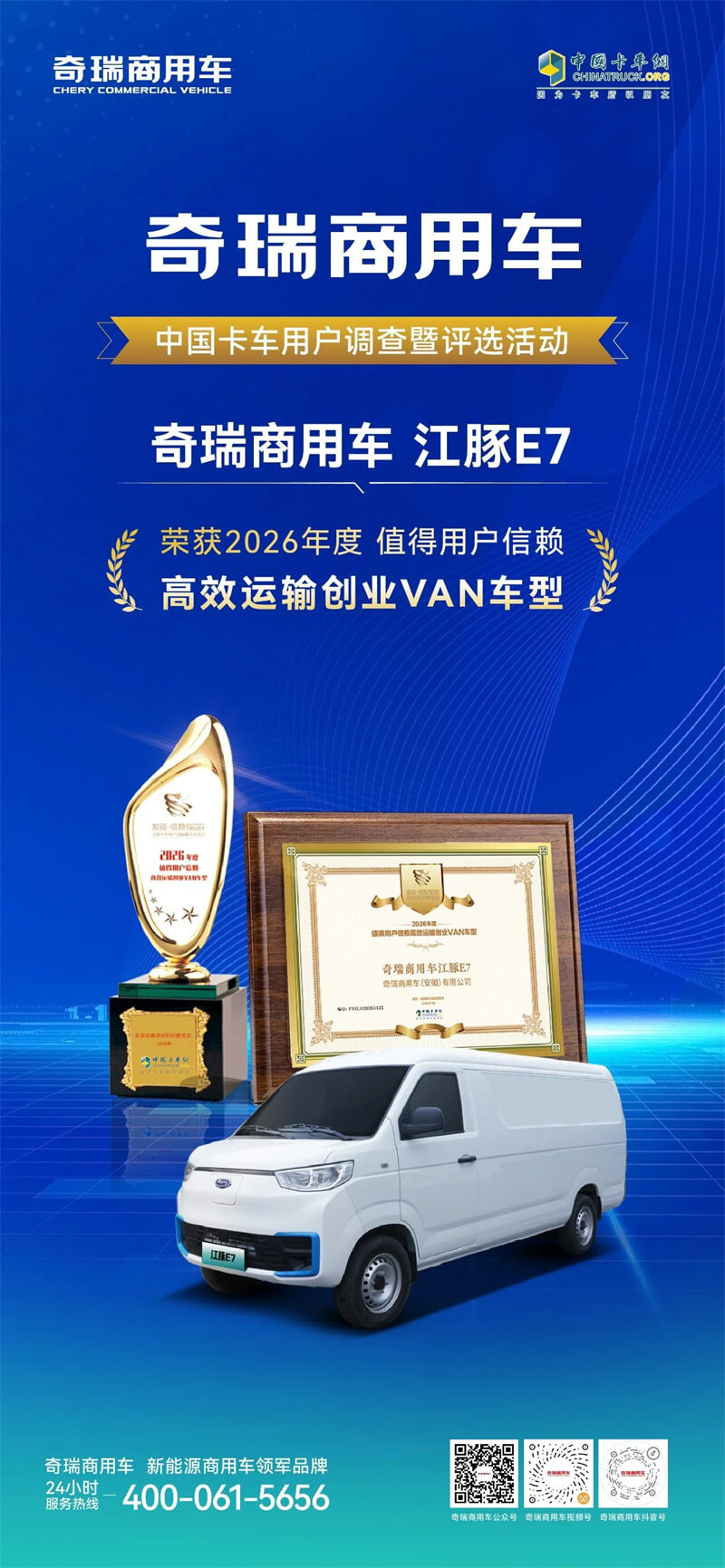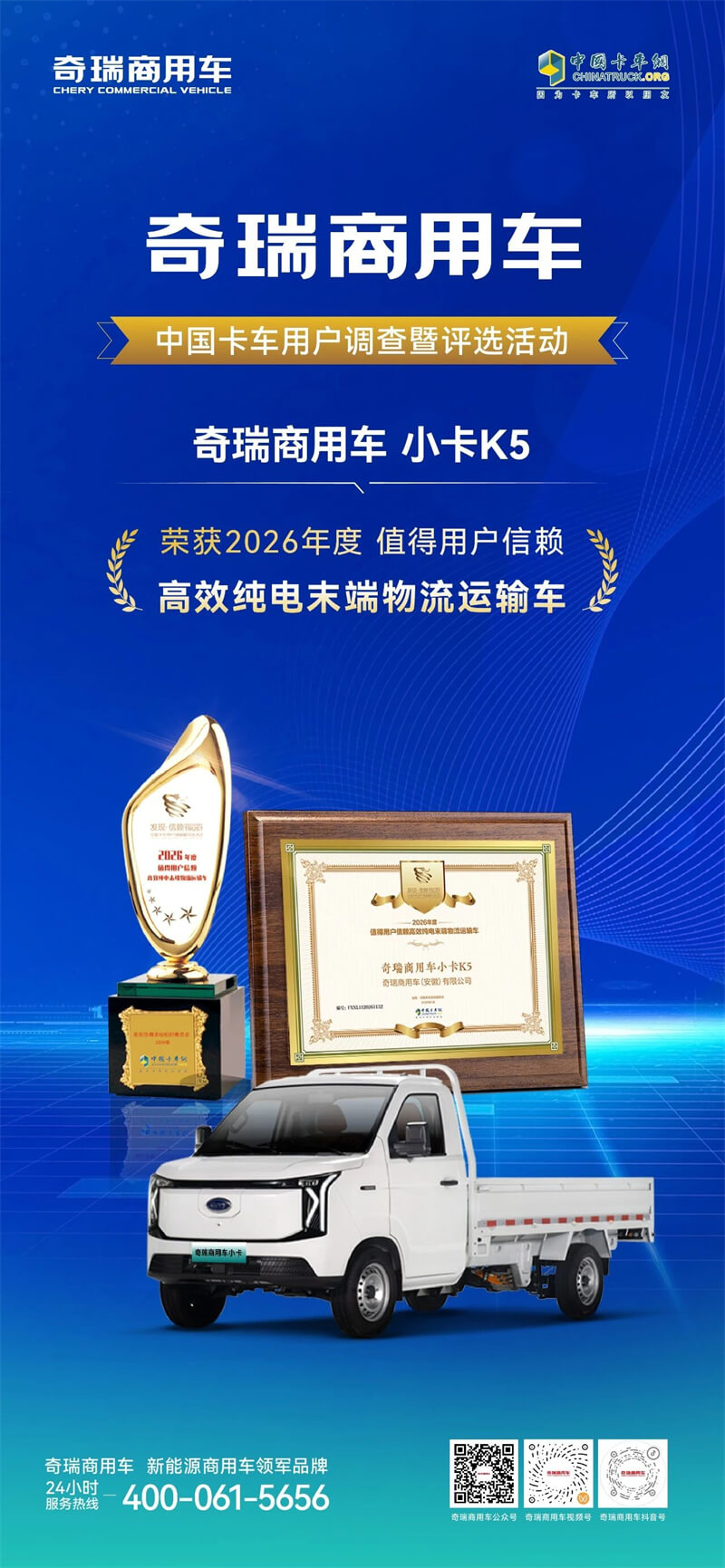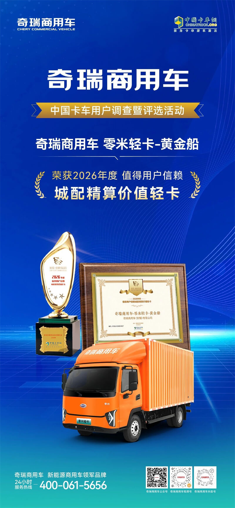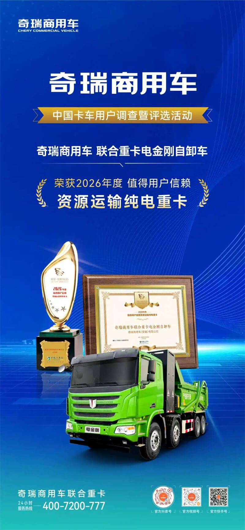 2026年1月22日,由中国卡车网主办、中国交通运输协会物流投融资分会协办的的第十一届“发现信赖——中国卡车用户调查暨评选活动”正式揭晓榜单。凭借在新能源技术、场景化产品与用户价值上的突出表现,奇瑞商用车一举斩获四项重磅大奖,展现了行业与用户对其产品实力的高度认可。