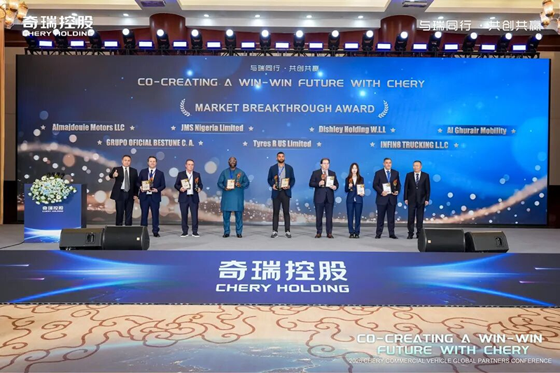 同心而行,不以山海为远。大会还隆重举行了2025年度优秀经销商颁奖典礼,设立“市场突破”“品牌之星”“销售之星”“优秀经销商”“特殊贡献”等多项荣誉,向过去一年为奇瑞商用车海外表现注入蓬勃动能的杰出伙伴致敬。一座座奖杯镌刻着拼搏足迹,更传递出奇瑞商用车与全球伙伴共担风雨、共享荣光的坚定承诺,进一步彰显“与瑞同行 共创共赢”的大会主题合作理念。